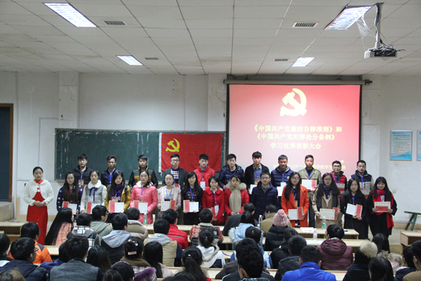 随后,召开的是优秀党员表彰大会。此次会议,是根据《中国共产党廉洁自律准则》及《中国共产党纪律处分条例》,对Beat365官网表现优秀的党员进行表彰奖励。该表彰大会的奖项分别是“优秀组织奖”和“优秀蹲点党员”。在会议主持人的名单宣读后,被表彰的各位党员分批上台,由易书记和曾老师亲自为他们颁发证书并合影留恋,希望他们再接再厉,为党效力,为人民服务。