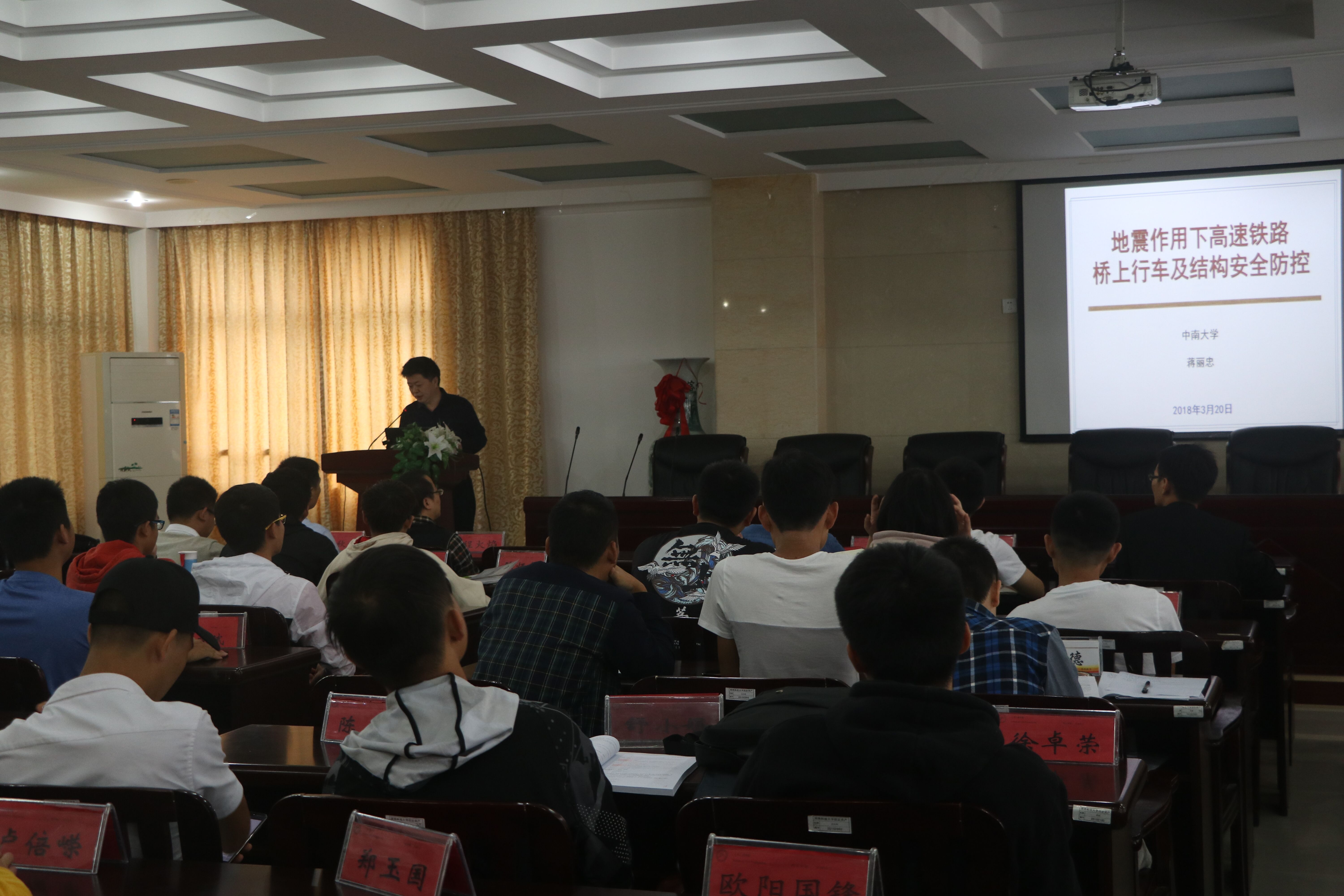 会议伊始,全体师生向主讲人蒋丽忠教授表示了热烈欢迎。随后,祝明桥院长从“地震作用下高速铁路上行车及结构安全防控”方面对蒋丽忠教授的成果进行了详细介绍。接着,蒋丽忠教授以“多动力作用下高速铁路轨道-桥梁结构动力学及安全防控技术”为报告主题进行了演说,并从研究背景、主要研究成果、总结、工程应用四个方面进行了论述,从高铁建设需求、技术疑难、立项情况等三个方面介绍了当前研究背景。当前的主要研究成果体现在实验系统的完善,分析、设计、安全评估的方法的进步及科研技术的提高等三大方面。蒋教授总结了四大主要创新点,提出了“两状态三水准”的抗震设防准则和自适应防风设计理念。在工程应用方面,蒋教授提到了高速铁路桥梁减震防震装置研究、常用跨度简支梁桥等问题。