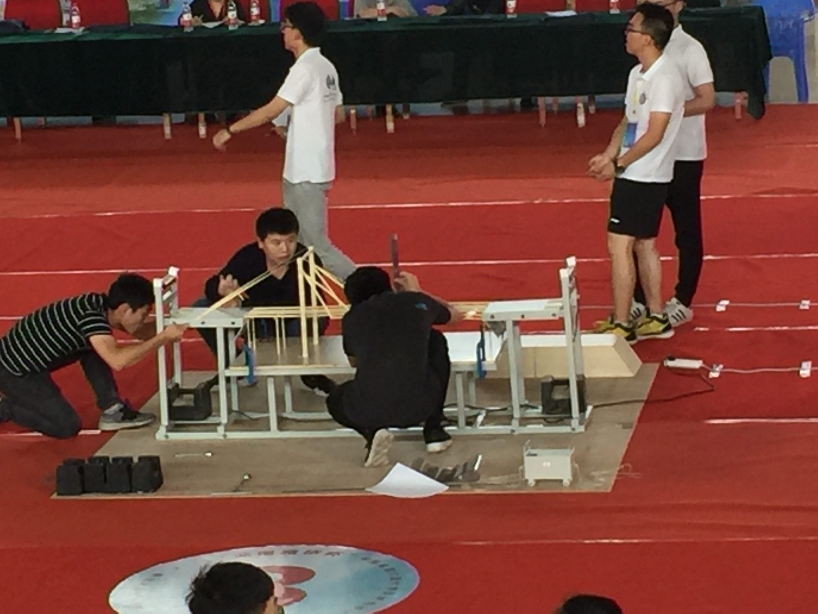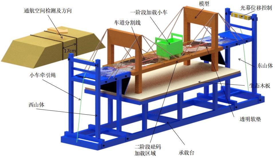 加载在两水平等高的山体平台间进行,分为两个阶段,第一阶段为8kg标准小车移动加载阶段,该阶段有小车行驶过程中的模型位移限值;第二阶段为跨中极限加载阶段,最大额定加载重量的40kg的砝码。模型评分由计算书以及设计说明(10分),结构选型与制作质量(10分),模型制作与加载效率得分(10分);模型承载力得分(70分,包括第一阶段40分和第二阶段30分)等四个部分组成,得分高者为优胜。