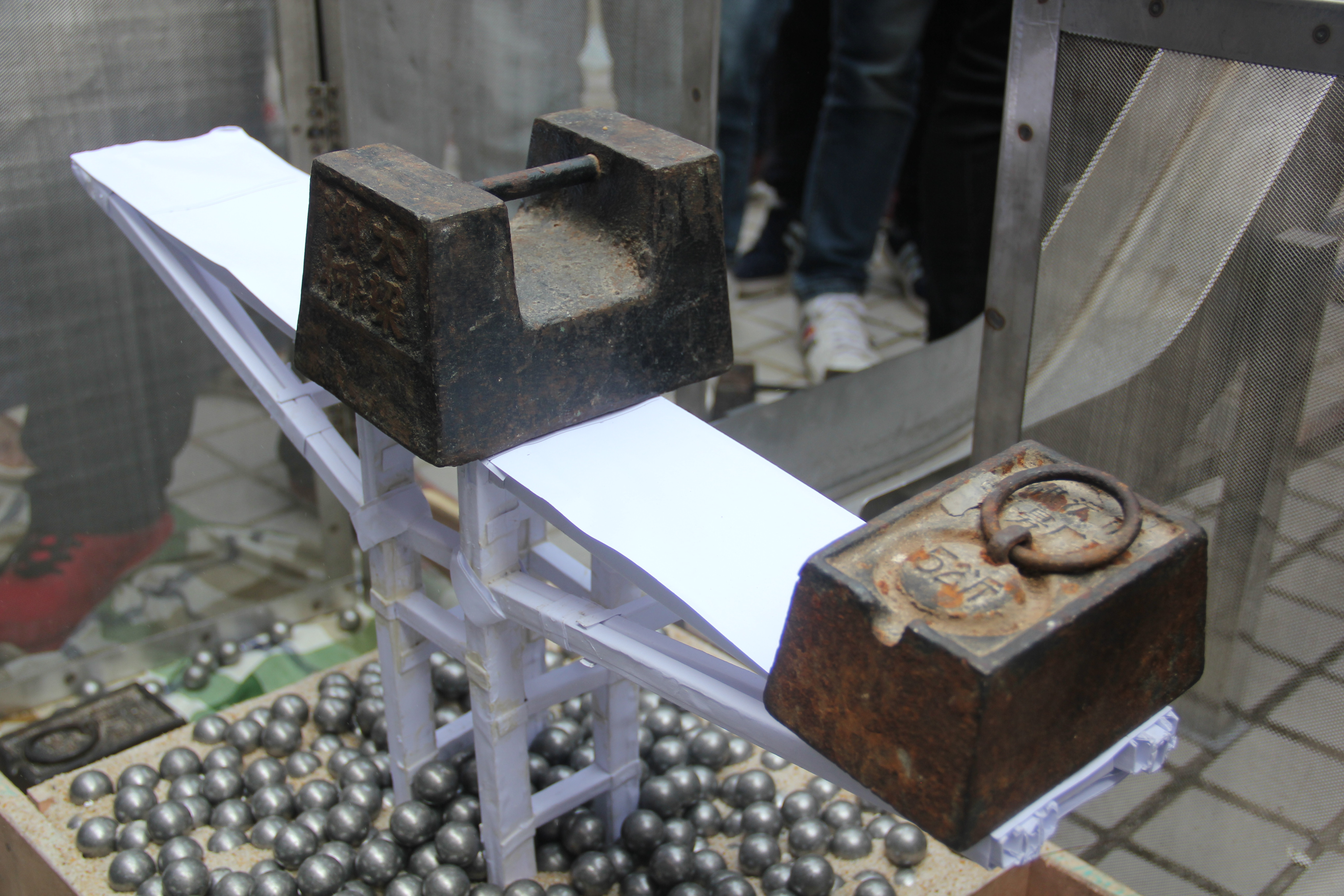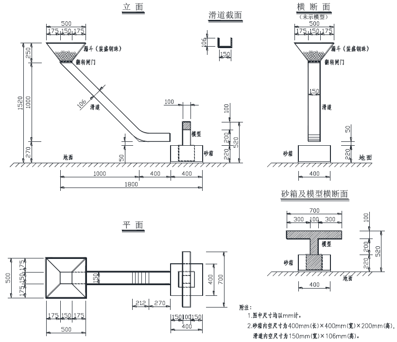 模型加载测试装置由四部分所组成,如图2所示,分别为安装模型的砂箱装置、装载钢珠用的漏斗装置、滑道装置,以及固定漏斗与滑道的支撑结构。试验加载分为两个阶段,第一阶段为包括对称载工况和偏载工况在内的两个5kg和一个10kg砝码分四级放置在梁顶面的加载区域的竖向荷载加载,第二阶段为保持竖向偏载工况下释放漏斗内钢珠(直径25mm,每颗重约64.2g,总重为40kg)的一次性冲击加载,加载后须保持20s。