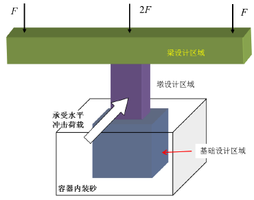 结构模型总体布置如图1所示,为一个双悬臂T形刚构。此T构模型可分为梁、墩和基础三个部件,梁直接承受竖向荷载,墩直接承受水平冲击荷载,基础埋置于填装砂子的容器中,提供模型的支承。