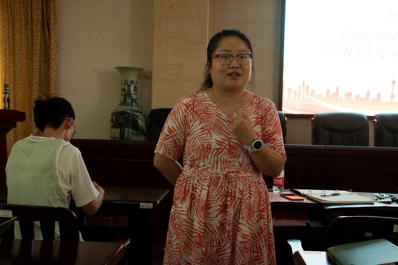 接着赵晓玲分享了她对养成教育辅导员的具体职责、角色定位和即将开展的新生养成教育工作的理解,其中最重要是要时刻清晰自己的身份定位,牢记自身的责任使命,努力做好新生适应工作和良好习惯的培养工作。她代表学院对各位养成教育辅导员寄予厚望,希望大家能够不忘初心,在为新生领路的同时也收获一个崭新的自己。