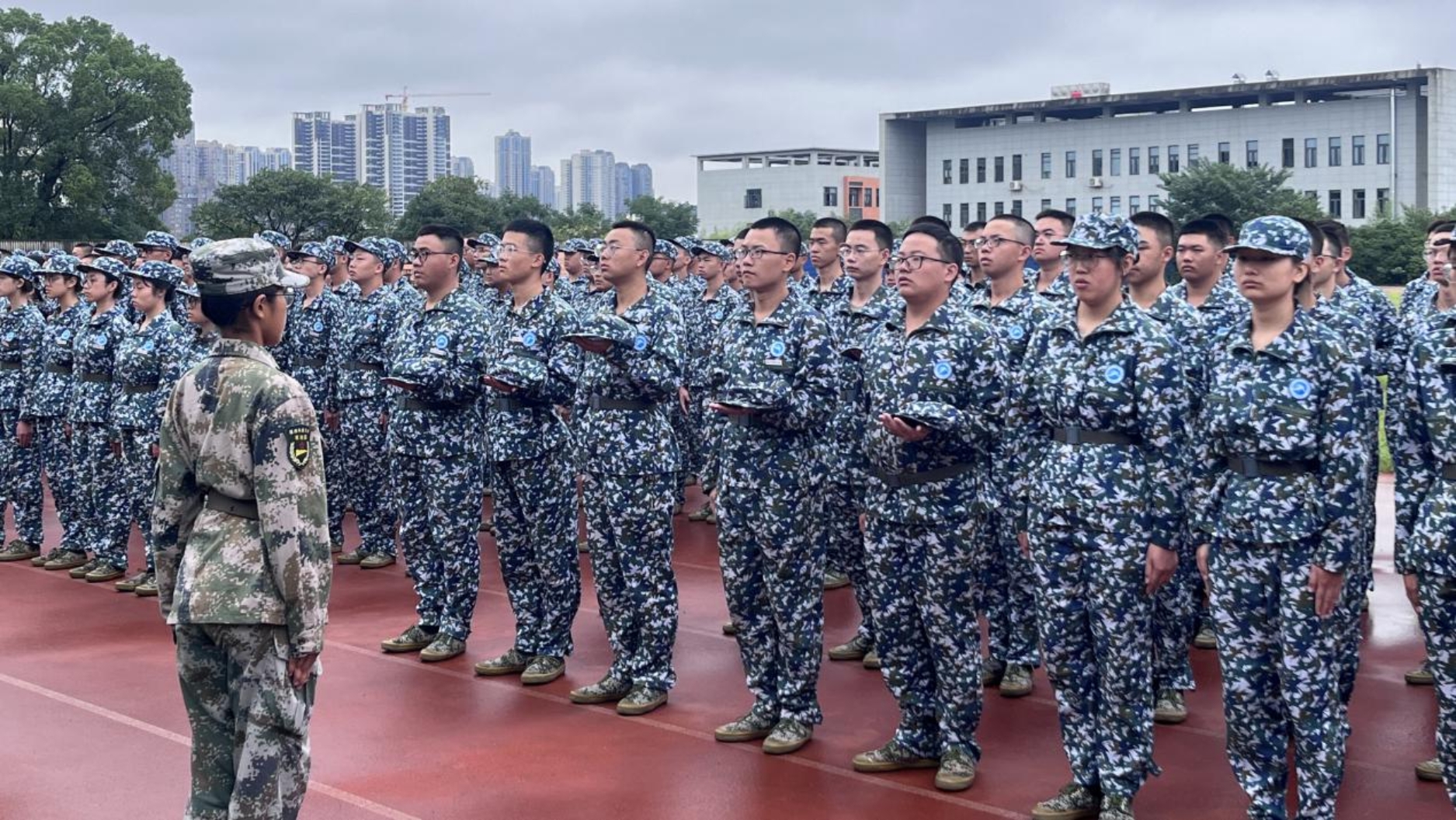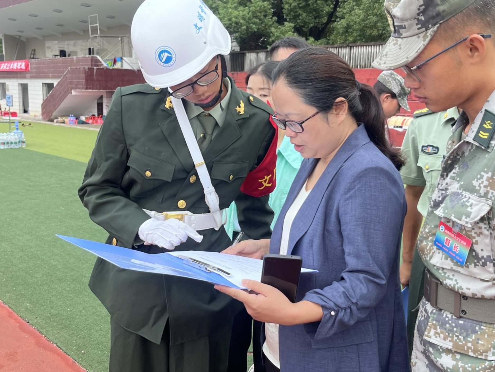 2023年9月21日,Beat365中国唯一官方网站23级新生在第二田径场认真开展军训。院党委副书记陈笑、学工办主任周姣术和校督察队队员到达军训场地,与教官们一起对新生的军容风纪进行了全面检查。