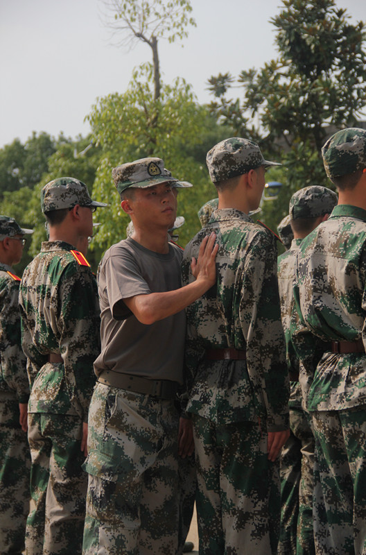 “头要正,颈要直,口要闭,两眼目视前方,两脚跟靠拢并齐,两脚尖向外分开60度;两腿挺直,小腹微收,自然挺胸;两肩向后张,两臂自然下垂;手指并拢微曲,拇指尖贴于食指第二节,中指贴于裤缝。”这铿锵有力的声音一直在军训场上回荡。