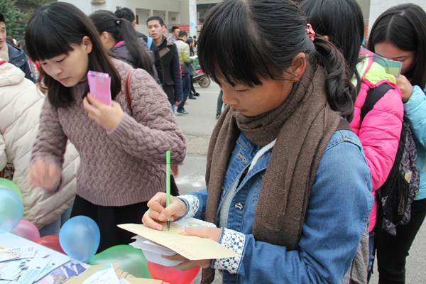 活动主要包括时空邮差,合影和创意猜字谜三个部分。时空邮差给了同学们一个与未来的自己跨时空对话的机会,随着那一封信投入邮箱,一次与未来的自己的约定也就随之产生了。其次,在时空邮差中同学们还能给未来的其他人写一封信,送上长远的祝福,带来温馨的感动。时空邮差不仅跨越了空间,而且还打破了时间的限制,让同学们与未来的人们进行了一次心灵的交流。与此同时,在合影和创意猜字谜活动中,同学们不仅感受到了乐趣,而且还学到了许多有关心理健康的知识,消除了自己对心理咨询的不安与抵触情绪。