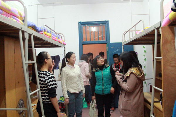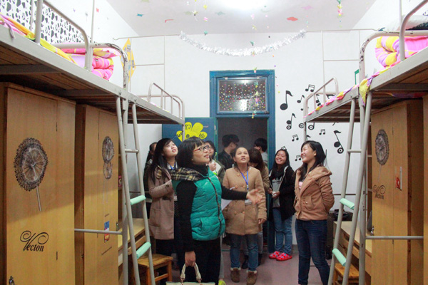 评委团一行人首先来到的是8区女生宿舍的409寝室,罗小红刚一进门就忍不住盛赞到:“犹如走进一个婚姻的殿堂,有非常浪漫的感觉!”当问到409为什么要这么设计时,女生们回答道她们就是想找到一个家感觉,寝室就是她们的家,室友就是她们的家人。接下来,评委团还参观了其他寝室,罗小红和罗佳都对她们的设计赞不绝口。