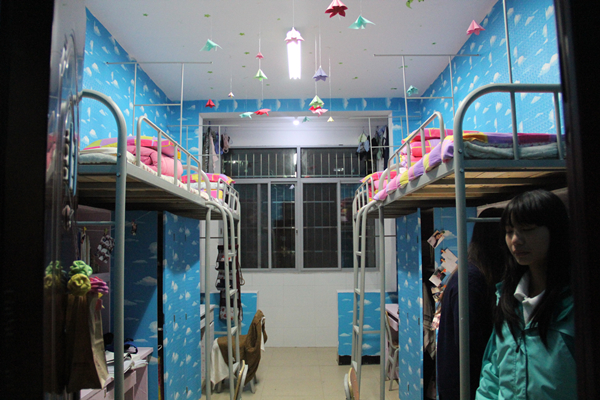 15级新生积极参与本次活动,寝室装饰独具匠心,简洁温馨。评委团一行人首先走访的是男生寝室,一区3栋204宿舍的简约风格令人眼前一亮,墙上贴满了宿舍同学写的书法作品,刚劲有力的毛笔字使得整个寝室洋溢着浓浓的文化氛围。608宿舍的格调清新,从门口挂着的风铃到天花板悬挂的书签都给人以美的享受。407宿舍的彩灯设计也是别出心裁,令人赞不绝口。4栋103宿舍变废为宝,用旧报纸做墙纸,既美观又大方。继而,他们参观了女生寝室,八区18栋206寝室,其名为“暮归小屋”,整个寝室以粉色为基调,突显家的温馨。据她们介绍,墙壁装饰多为她们自己设计制作,如心情墙,梦想墙。用大米、黑米、绿豆粘贴而成的“土木学子,青春无畏”四个大字更让评委们惊叹。而以绿色为基调的318寝室也获得一致好评,她们将环保理念巧妙的融入装饰设计中,寝室整体清新自然。同时,雷石山和刘星也很关心学生宿舍生活中所遇到的问题,他们检查床铺、门窗是否安全,询问宿舍是不是漏水,热水方不方便等,然后还不断叮嘱“有问题的话一定要及时报修,我们会尽快的为你们解决的。”