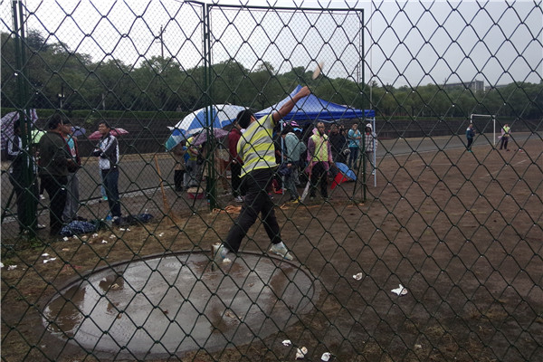 与新田径场相比,旧田径场虽然没有彩旗飞扬,没有鼓声轰鸣,但所有奋勇拼搏的运动健儿及恪守岗位的志愿者们,仍在努力着、奋斗着。灰色的天空下,雨一直下。在雨中,Beat365官网的选手鲁好辰,手握铁饼,做着准备活动,只见他奋力一掷,手中的铁饼如飞鱼般在天空中划出了一道完美的弧线。在落地的一刹那,随着一声脆响,雷鸣般的掌声在周围的人群中爆发。