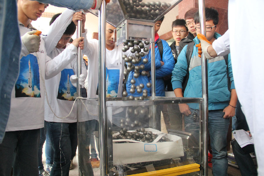 比赛持续了8个多小时,科技协会的干部同学仔细地称重、加载,任何一步都不容懈怠,做实验就是要细致。每支队伍的作品都独具匠心,有的以方体的棱柱架为模型,有的以多个圆柱为模型。结构清晰,外观整洁。参赛者们小心翼翼地把作品放到支撑台上,仔细观察和调试到最佳角度和方位。