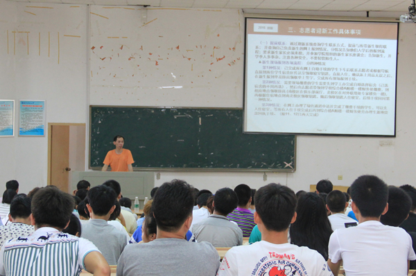首先,15级辅导员雷石山就2015级新生整体情况、新生报到行程安排、迎新工作具体事项、对志愿者的相关工作要求为志愿者做了充分讲解。‘让我们齐心协力,为2015级新生提供更好的服务’雷石山如是说。接着,学工办主任虢利钢发表讲话。“迎新体现在‘迎’和‘新’!志愿者要真诚友善,为新生提供更便捷的服务;学校迎新系统的改革,为新生报到提供了极大的便利。”他提出两点期望:志愿者应熟悉自己的岗位,熟悉迎新的时间地点和接待的新生;志愿者应提供最好的服务,让每位新生知道自己在什么时间应该做什么事。最后,易贵元强调了关于迎新的一些事宜。“志愿者要无时无刻体现出科大人热情、文明、礼貌、大方的一面,请各位精诚团结,有效率地开展工作,使新生能够平安入校,使志愿者得到完美的锻炼”。