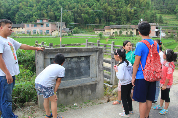 随后,志愿者团队和孩子们一起走到了村口,村口有一座白坪桥,于2005年建成,为整贫致富,将白坪村建设成幸福村及山清水秀花香鸟语林茂粮丰物华天宝之地。路桥系专业的志愿者覃宇鹏紧接着为孩子介绍了桥梁的大致构成,还给孩子们看了许多世界上著名桥梁的照片,孩子们纷纷发出由衷的赞叹。村口还有两棵叫甜槠的三级保护古树,已有210的“高龄”。