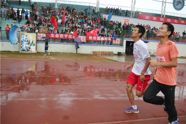 天空乌云密布,下着蒙蒙细雨,却不能阻挡住运动员们的奔跑。一声枪响,运动员们像一支支离弦的箭,纷纷飞向渴望已久的终点。一圈过后,运动员们体能有所下降,但是疲惫却没有战胜运动员们内心的坚持。终点就在眼前,运动员们用尽最后一丝力气,加速,加速,再加速,直到他们冲过终点。冲过终点之后,他们有的晕了,有的甚至摔倒了。但,那有怎样,他们依旧是最棒的,因为他们坚持信念,他们战胜了自我,他们应为自己骄傲。