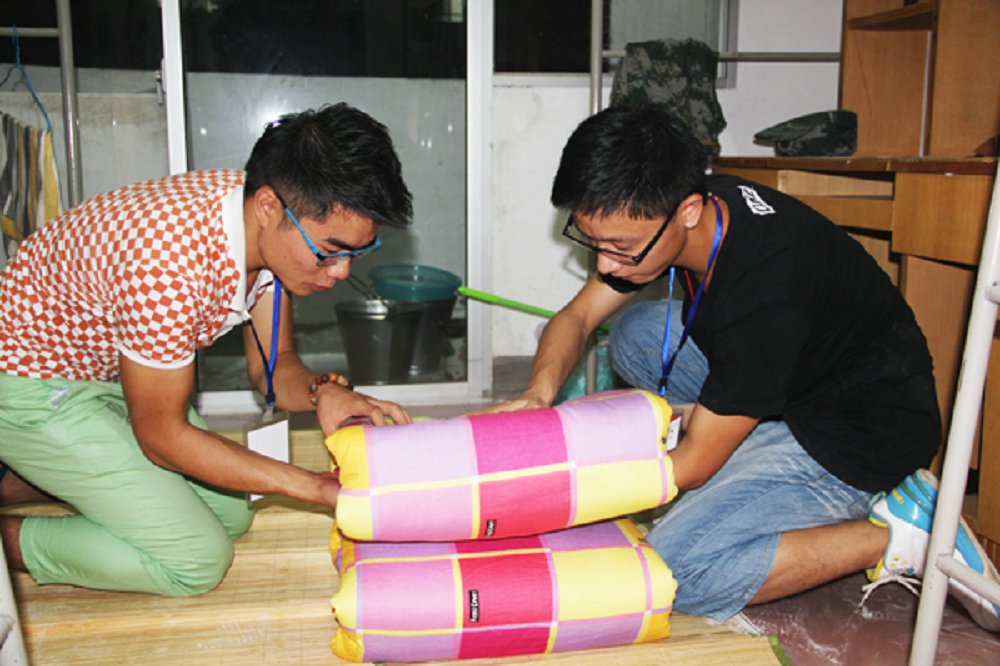 Beat365官网志愿者下寝教新生叠被子、老师下寝指导工