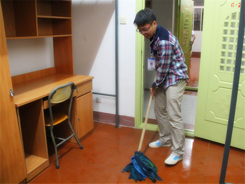 当天晚上,每一位新生都积极参与到搞卫生的活动中,尽管已经军训了一天,但他们对待每一个角落:厕所、窗台、玻璃、书桌……都“不放过”。新生们有的用抹布擦洗书桌,有的用扫帚清理垃圾,有的用拖把打扫地面。认真负责的他们在不断地劳动着,而到场的学姐学长们也帮着他们一起打扫。虽然新生军训了一天很累,但是他们仍然很积极,并不断地与学姐学长们交流大学生活,询问自己专业的知识。最后他们都流汗了,但是每一个人都很开心,因为这也是一次心灵的交流,更是一种意志的磨砺,军人生活的体验。