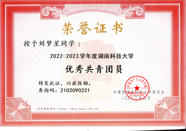 刘梦星热衷于参加志愿服务活动。作为一名预备党员,她以身作则,发挥模范带头作用,累计参加志愿服务活动40余次,志愿服务时长达200余小时。她主动报名成为“蓝信封”志愿活动通信大使,与偏远地区的留守儿童通信,用纸张文字抚慰他们的内心,引导他们的成长;大一和大二暑假,她两次参加三下乡社会实践志愿服务活动,用文字与照片记录志愿服务之旅中的温情。此外,她还参与了防疫站岗、水质检测、祭拜革命先烈、关爱空巢老人、纪念齐白石等多项志愿活动,为志愿事业贡献了自己的微薄之力。