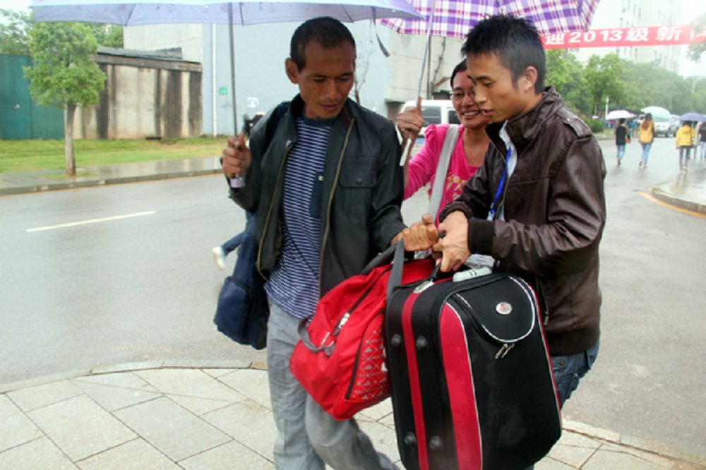 新生在南校注册完后乘专车来到北校体育馆前,在北校体育馆前面聚集了很多迎新志愿者,看到迎新车的到来,现场一下子就变得热闹起来,他们举着写有“土木学院”的牌子一路狂奔,希望学弟学妹能在下车的那一刻看到他们感受到学长学姐的热情,体验到“家”的温暖。当看到有新生从车里走出来时,志愿者就晃动着牌子高呼“土木学院、土木学院”。一位独自来报到的新生在志愿者的带领下顺利地完成了报到注册、领取了卧具、军训服、钥匙。一路上她好奇地向志愿者询问大学生活是怎样的,如何加入学生会,怎样参加社团等问题,好似要迫不及待地投入大学生活,陪同的志愿者耐心的为她一一解答。在采访中,当被问到为什么敢独自一个来报到的时候,她笑着说:“其实在没到学校之前还真的有些担心,不过一下车看到你们的笑容,感受到你们的热情,觉得那些担心完全是多余的,有你们真好!”