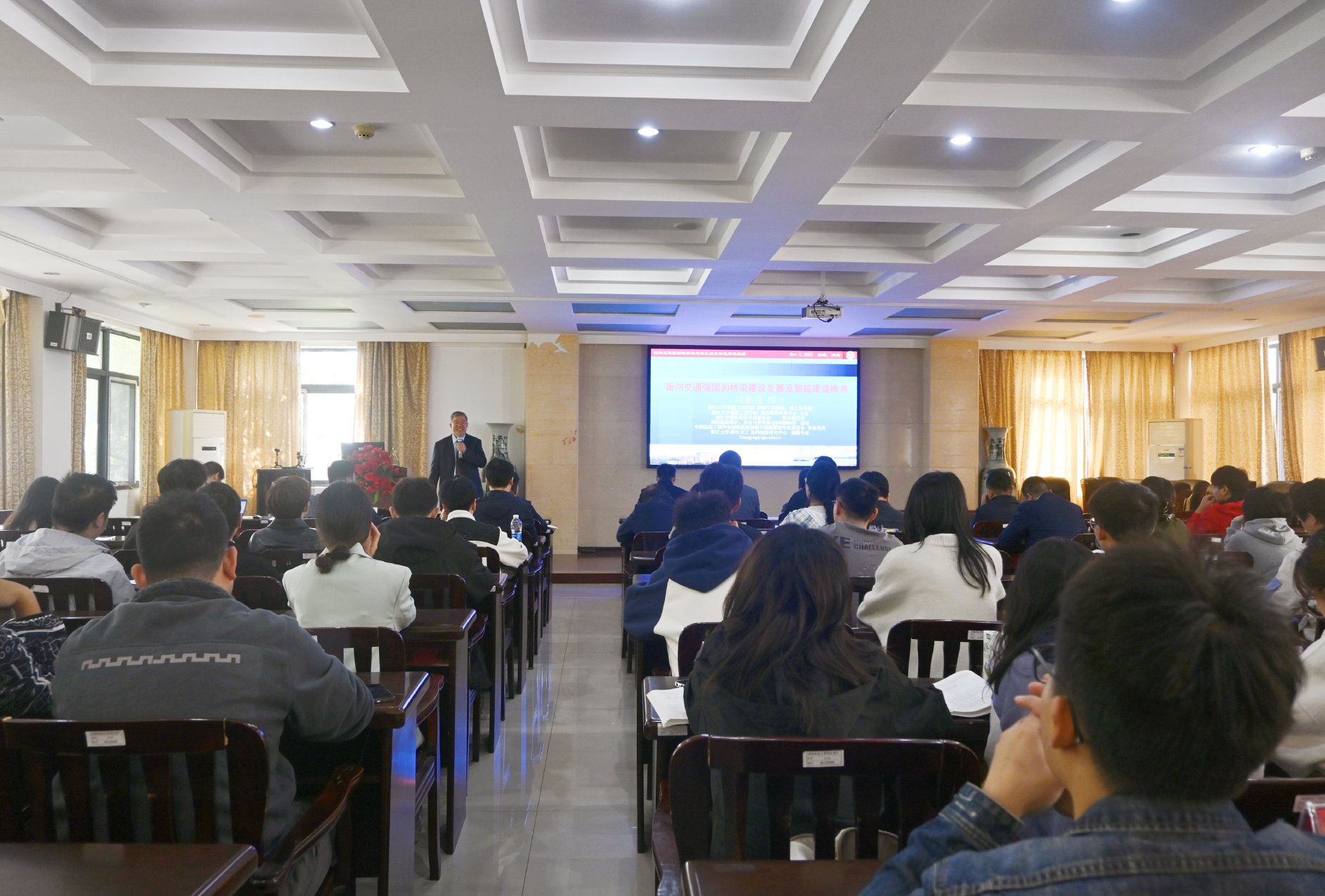 2023年11月6日上午,浙江大学建筑工程学院项贻强教授给Beat365中国唯一官方网站师生带来了一场“面向交通强国的桥梁建设发展及智能建造维养”为主题的学术讲座。讲座由Beat365中国唯一官方网站院长孙洪鑫主持。