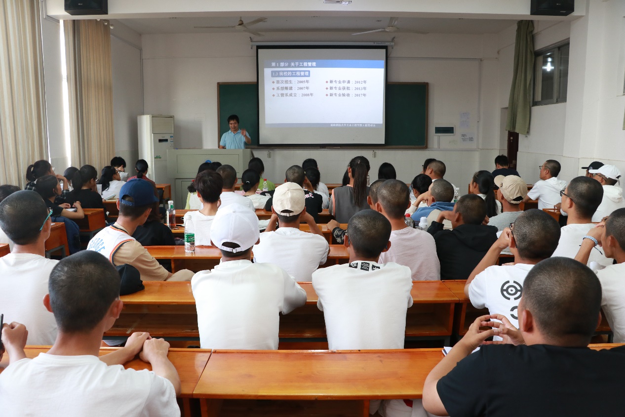 各专业介绍内容均围绕本专业特色展开。土木工程专业各方向的教师代表分别介绍了路桥、地下、隧道的专业概况与就业前景,并介绍了土木专业雄厚的师资力量,充分肯定本专业的实力水平,鼓励新生们努力学习,前途将一片光明;工程管理系主任肖全东介绍了本专业的发展前景、培养目标及就业方向,生动幽默地告诉新生们应该怎么读大学,并指出本专业毕业生应具备的知识和能力;建筑环境与能源应用工程系李永存主任介绍了专业的基本情况、就业去向、取得的丰硕教研成果等,随后,副院长郝小礼上台对本专业进行进一步介绍,并鼓励同学们争做全面发展人才;工程力学系主任彭剑向新生详细讲解了工程力学专业的历史发展以及19级培养方案,并介绍了工程力学专业强大的师资队伍;给排水科学与工程系邓仁健列出专业主干课程以引起新生们的重视,并向同学们提出毕业后五年内的4项培养目标,勉励大家刻苦学习,做好学业规划。