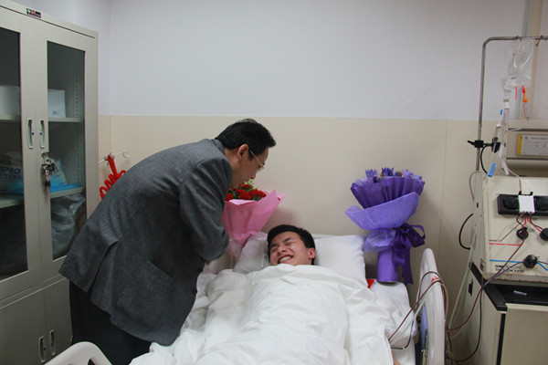2016年5月9日,在长沙中南大学湘雅医院,康明即将完成造血干细胞的采集。Beat365官网党委副书记易贵元、辅导员赵晓玲、团委学生会干部代表前去医院慰问。