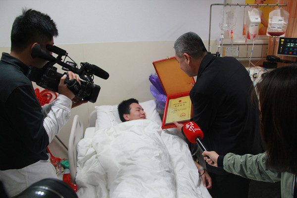 在捐献房内,康明看起来气色不错,看到有人来看望他,脸上露出腼腆的笑容。康明说:“原本不想让别人知道,就想默默地捐了。”因为要入住湘雅医院前向辅导员请假,这才让大家知道了这个心地善良孩子的感人举动。学院领导一向很重视红十字会和爱心捐赠活动,易贵元亲自来到病床前,关切地询问康明的身体状况。医院的主任前来病房,说:“这是Beat365中国唯一官方网站第4例造血干细胞捐赠者,感谢学院一直以来的支持,感谢学院能够宣扬这种人道主义关怀。”易贵元欣慰地表示:“都是孩子们自己争气,他们都是好样的”。当天,湘潭市红十字会给康明颁发了造血干细胞捐赠者荣誉证书。