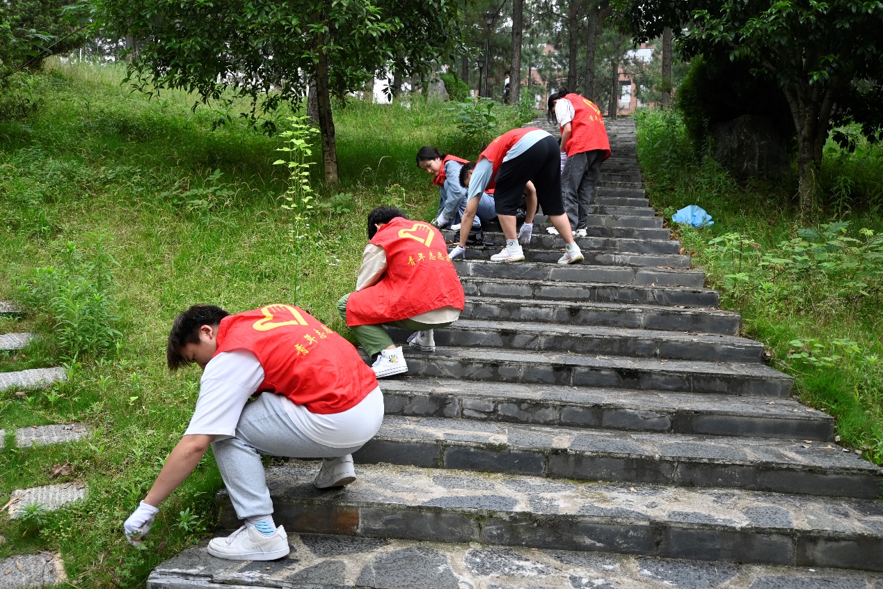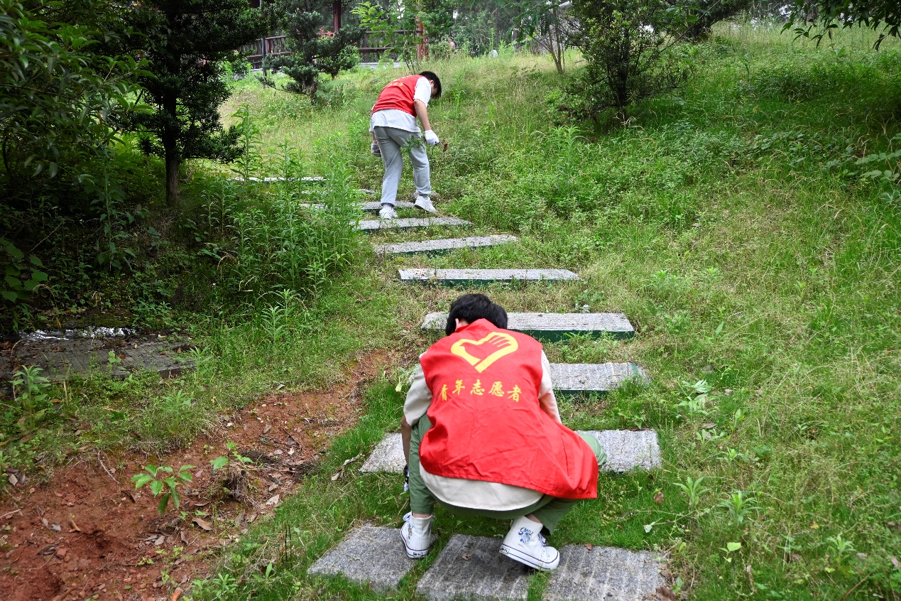 图为志愿者们共同清理松园阶梯旁侧杂草。