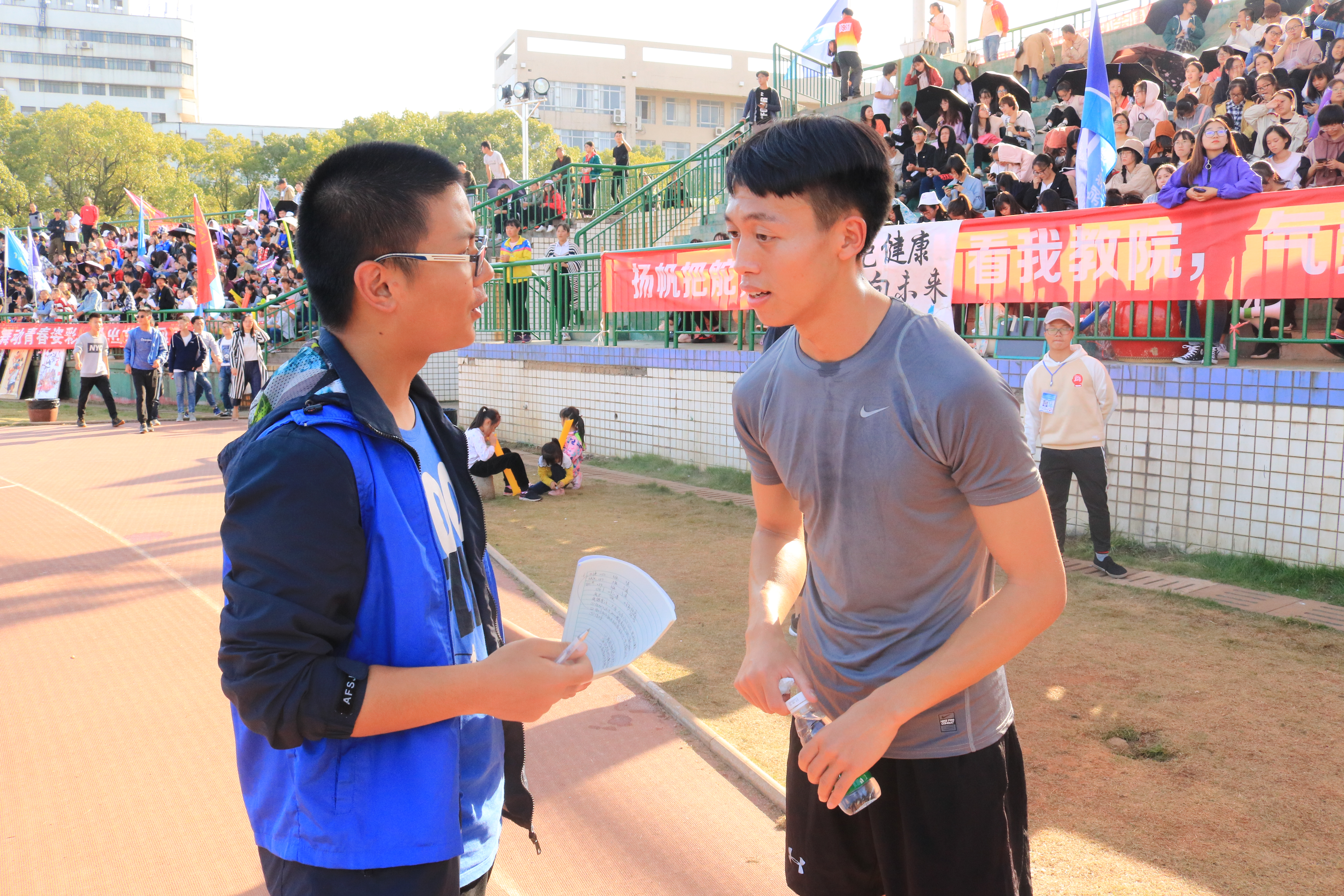 10月27日下午3:00男女子3000米比赛正式拉开帷幕,代表Beat365官网参赛的女子组队员有李沛柔、罗洁雨,男子组有叶江涛、阳鑫。看台上旗帜飞扬,观众们兴致高涨。