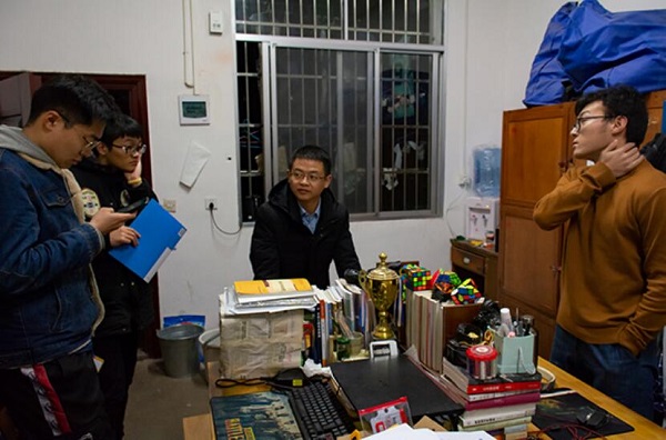 校团委书记马缤辉,18级辅导员廖继彪在视察寝室