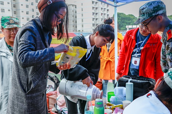 上午时分,20级辅导员赵晓玲老师和肖鹏飞老师前去慰问军训学生,及时与值班的团委学生会干部沟通,将存在的问题一一解决,极大的促进了新生们的军训积极性。老师们特别强调保暖问题,他们要求休息棚中的学生时常站起来活动身体以增强保暖。与此同时,外联部专门为新生们准备好红糖姜茶,为他们送去了温暖。外联部属于团委学生会之一,本着“立足校内,走向校外”的宗旨,以“实践自我,服务全院同学”为目标,以“高质、高效每一天”为工作理念,他们“送温暖”的举动极大的体现了部门特色与精神。在这寒冷的天气里,在老师和学长学姐的呵护下,20级新生感受到了极大的鼓励和暖意,他们表示一定会好好训练,展现土木学子的风采。