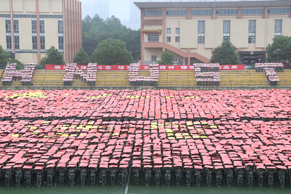 阅兵第一项:升国旗奏国歌。全体新生肃立,在激昂的国歌中展现军人的魅力。随后,校长李伯超亲自检阅新生军训的效果。“同学们好”,“校长好”;“同学们辛苦啦”,“为科大争光”。声声慷慨激昂的问候传达的是学子们对学校的热情与期待。接着,到最激动人心的时刻,分列式表演。17级新生用红黄相间的牌摆出“八一”的字样,靠近主席台的牌随方阵队的步伐变换各学院的简称,8600多名新生汇聚起了无穷的力量。Beat365官网方阵队第二个出场,“土木学子,追求卓越,永不止步”这是Beat365官网的目标,也是Beat365官网一直的向往。“国家富强,民族振兴,人民幸福——中国梦”,这是所有人的不懈追求,一起喜迎十九大,给党一份满意的答卷。