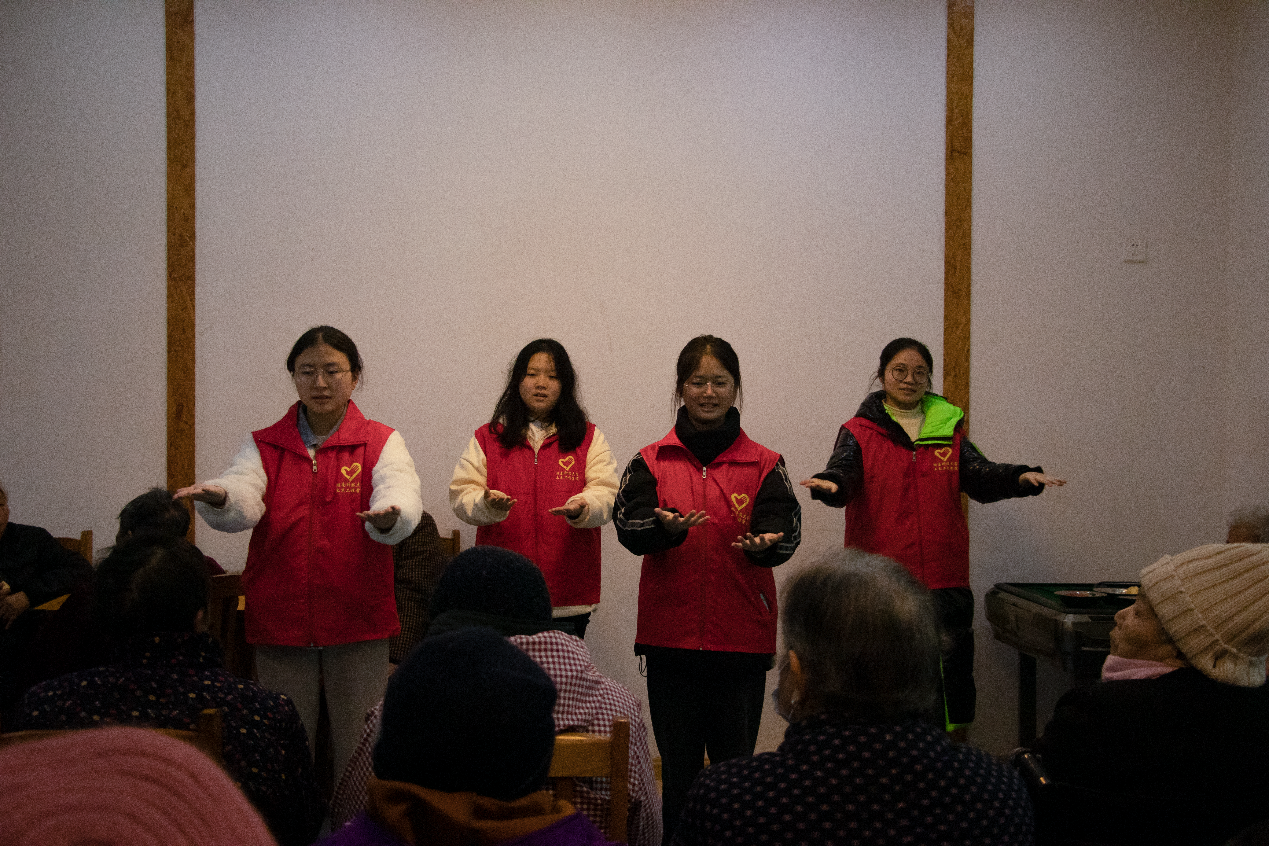随后,志愿者邀请老人们观看志愿者分会精心排练的文艺演出,考虑到一些老人腿脚不便,志愿者们便将其一一搀扶。待老人们陆续进入大厅后,志愿者们上台表演节目。在志愿者们的感染下,不少老人情绪高涨,跟随音乐挥舞起了双手,亦或是加入其中。表演结束的志愿者们又为老人们准备了套圈小游戏,简单的游戏让老人们精神矍铄,纷纷积极参与。