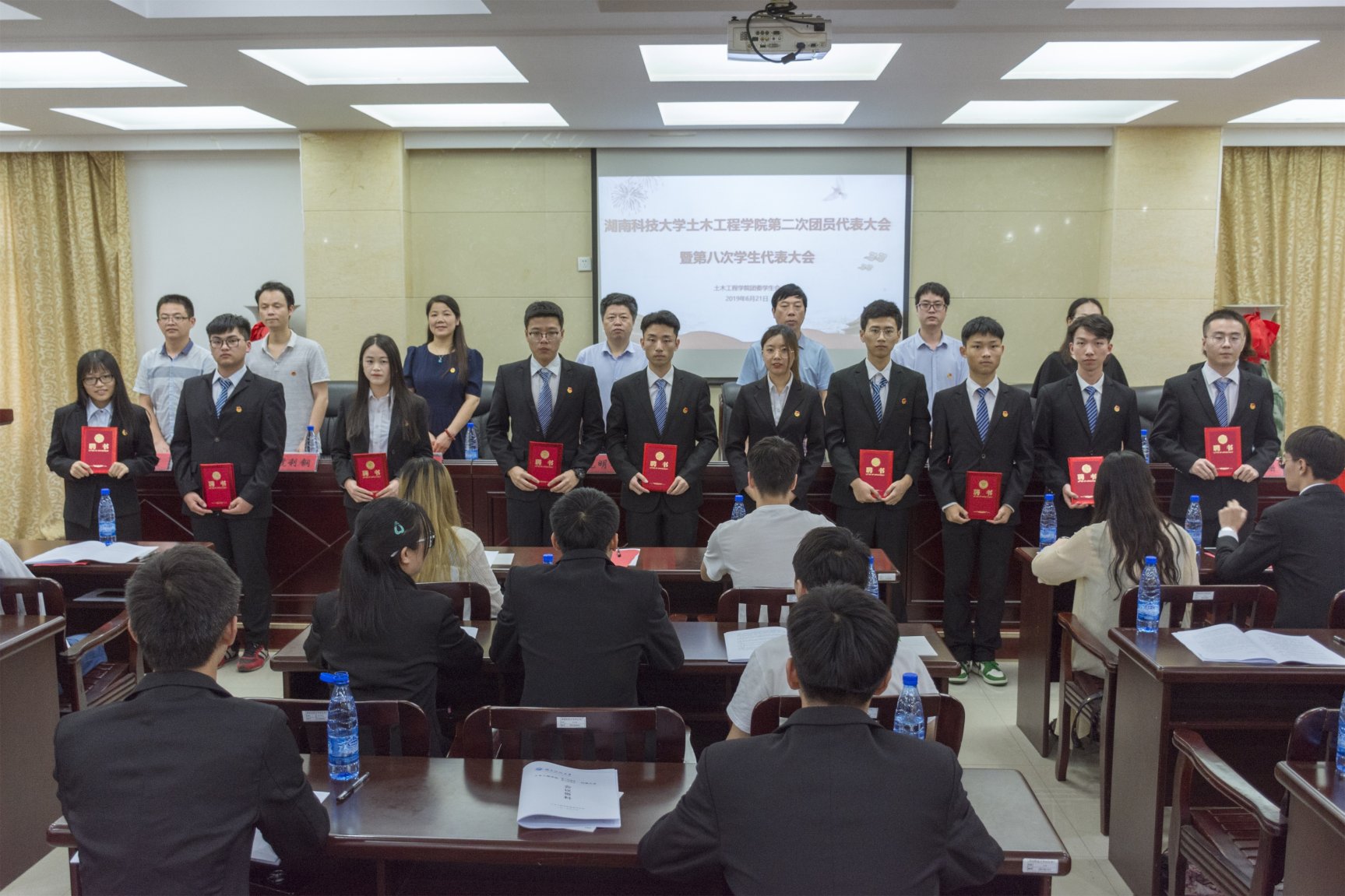 大会在庄严的国歌声中拉开帷幕。会议共分为两阶段,第一阶段会议开始,由院长祝明桥致开幕词。他提出,本次会议,是Beat365官网青年学生和学生组织在政治及社会生活中的一件大事,也是共青团的一项重要工作,院团委及学生会对本次大会都给予了高度的重视。随后,全体代表及嘉宾听取了由第十六届团委第二副书记杨佳敏和第十六届学生会副主席付杰宣读的报告,前者以“打造全新土木品牌,开创团委工作新格局”为主题,展现了继往开来、承前启后的学生工作精神,后者则以“一个目标、两个基点、三个创新、四个途径”为线索展开报告。曹文星、刘佩、陈灵珊针对报告分别发表讲话,表达对过去一年中学生工作的认可,同时对新一届学生工作给予厚望。最后,各院领导及嘉宾为第十六届团委学生会主席团及部长颁发聘书。所有与会人员随后至土木楼大厅合影留念。