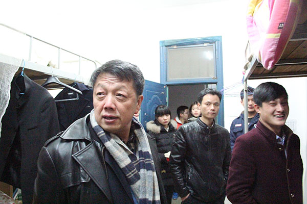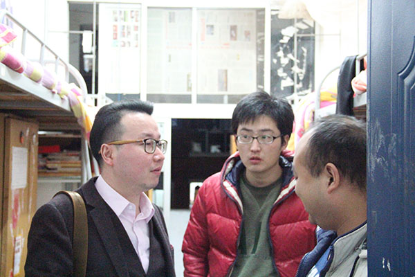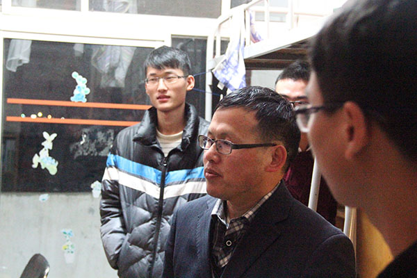 钟院长走访查看了每一间寝室,其中,618寝室的手写对联给人留下深刻印象。519寝室干净整洁的环境让人耳目一新。509寝室里热火朝天的学习氛围感染了所有人,钟院长俯身亲切询问,杨天春老师也开始为同学们讲解疑问。相比之下,有些寝室就不尽如人意了。对于个别寝室出现的卫生杂乱,学习氛围淡薄等问题,钟院长提出利用空闲时间丰富自己的建议,不能出现“不考研就流放”的情况,也要注意“买电脑是为了学习”的初衷。并坦言“当十年之后再回首,你会感谢现在自己的坚持。” 钟院长还语重心长地强调说:“每天晚上7:30到9:30这两个最好用来学习,在寝室多做作业,少玩手机和电脑游戏,为签下一个满意的工作做准备。”