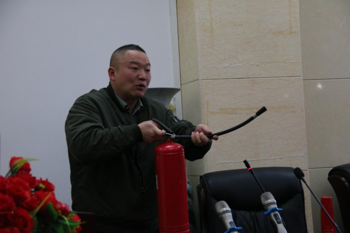 然后陈富源以目前生活中常见的三种火灾类型切入,为教师们讲述了不同类型火灾问题发生后对应的处理方案,丰富了大家的消防安全知识。陈富源重点讲解了防烟毒面罩的正确使用方法,并且亲自戴上防烟毒面罩为大家演示。陈富源也向大家科普了手提式灭火器使用方法,分为“摇”、“拔”、“喷”三个步骤,但他也提出了手提式灭火器的“比较沉重”、“容易爆炸”等缺点,并为教职工们推荐了更为方便的便携式灭火器。
