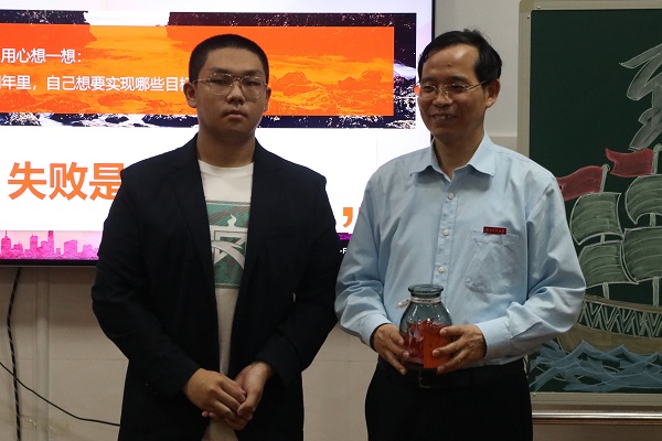 简短的视频呈现着同学们从中学稚嫩少年到大学军训后阳光青年的蜕变与喜悦;晶莹剔透的梦想瓶承载着同学们对未来的期盼与向往。接过满载着同学们憧憬的梦想瓶,朱川曲校长表示,作为班主任,他将与同学们一起积极建设班级,并对同学们今后的大学生活提出了四点希望:第一,立足新起点,树立新目标;第二,勤奋学习,刻苦钻研;第三,勇于实践,全面发展;第四,互帮互助,共同进步。他同时希望同学们在学习之余积极参加劳动与体育锻炼,争做德智体美劳全面发展的新时代大学生。