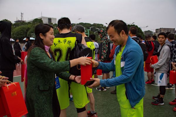 决赛开始,将由研究生队对上教职工队,本科生对上校友队。比赛打响,球员们迅速进入状态,一次次亮眼的动作引来现场观众的一片喝彩。只见校友队的一名球员打得火热,接球,转身,沉球,跃起,投篮一气呵成,“三分!”。这让校友队打出了气势,紧接着的连攻让本科生队疲于应对。下半场开始后不久,乌云不合时宜的出现,雨滴落下,尽管遗憾,比赛不得不提前终止。在学院党委书记陈秋南、副书记王艳及校友代表谢小鱼等为所有参赛选手发放奖品的过程中,本次“砼心杯”也落下了帷幕。