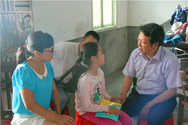 院长钟新谷和副书记易贵元在和一位小女孩谈心时鼓励她努力学习,将来考一个好大学,用知识来改变自己的命运。