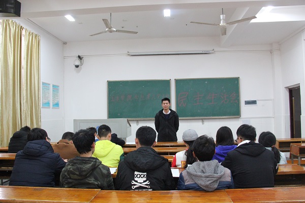会议主题为自我批评与反思。会议初始,由党支部书记胡志勇交代本次会议流程,讲述民主生活会对监督党员作风的政治意义,督促党员认真的进行反省。随后他上台进行自我批评,分析了过去一年在工作上的不足与缺点,认真接受其它党员的指正与建议,同时对新一年党支部的工作进行了规划与展望。其它党员干部也依次上台进行自我反思与总结,虚心学习其它党员干部优秀的行为习惯,吸取经验,总结进步,对新的一年许下了庄重的誓言。随后,党员干部进行了民主评议,由全体党员和三位共青团群众代表共同进行投票,选举优秀党员干部,以资鼓励。