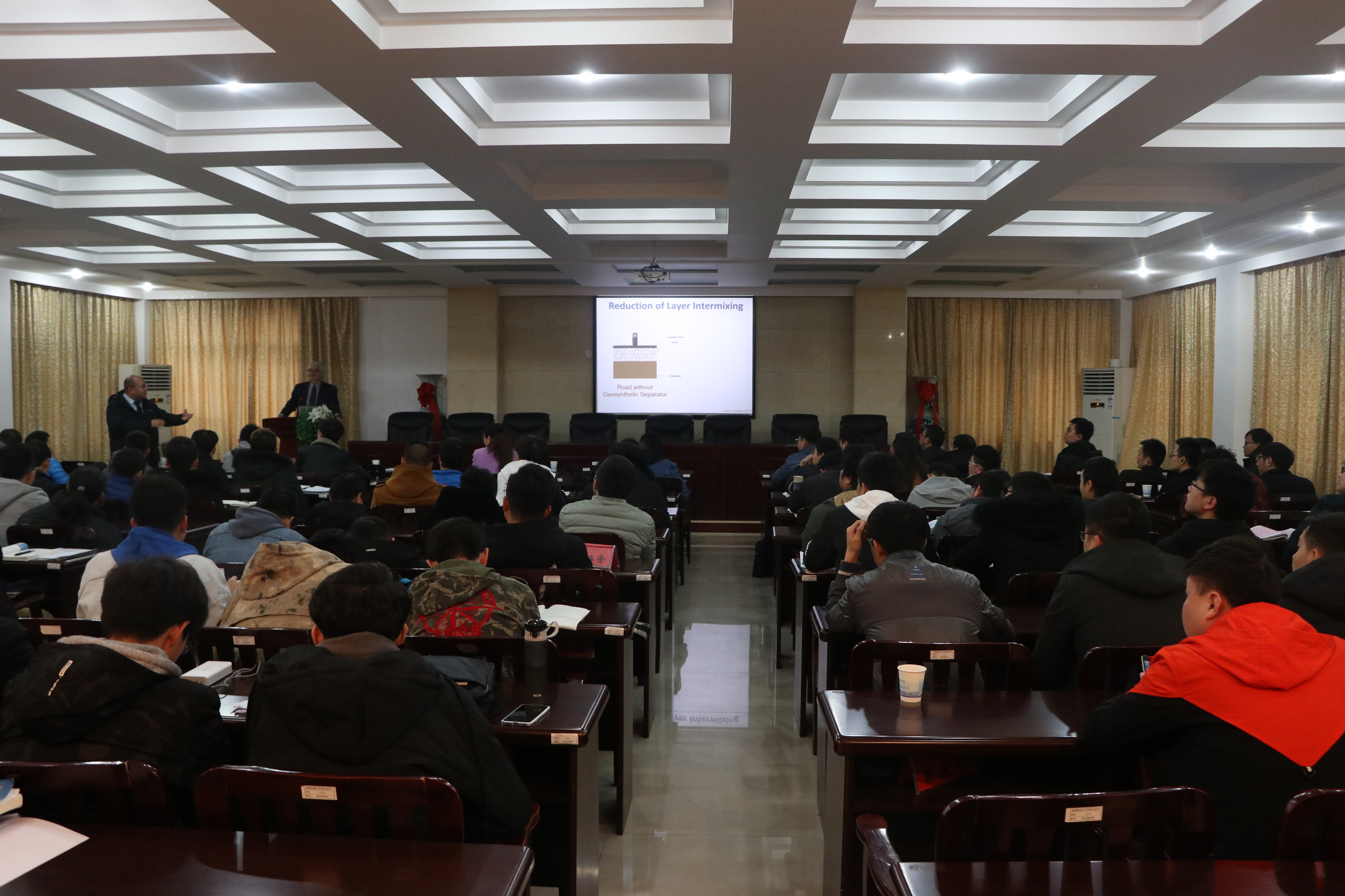 会议伊始,佐伯格教授直入主题,图文并茂的PPT展示了各种土木工程实操中的模拟动画,形象生动令人印象深刻。此次报告的主要内容为土工合成材料在道路工程中的应用,可分为土工合成材料的作用机理和土工合成材料在工程中的具体应用等,具体应用又包括防治路面反射裂缝、保持基层稳定、保证路基稳定、降低环境影响、降低含水率、防治膨胀土病害等方面。佐伯格教授特别提到土工合成材料在道路应用中的主要功能包括:分离、过滤、加固和排水,用于实现其所需具体应用。讲座内容既有理论分析,又有试验分析,还引用了多个工程案例,内容丰富。并且佐伯格教授邀请大家一起交流问题、分享想法,老师们和同学们都踊跃发言。