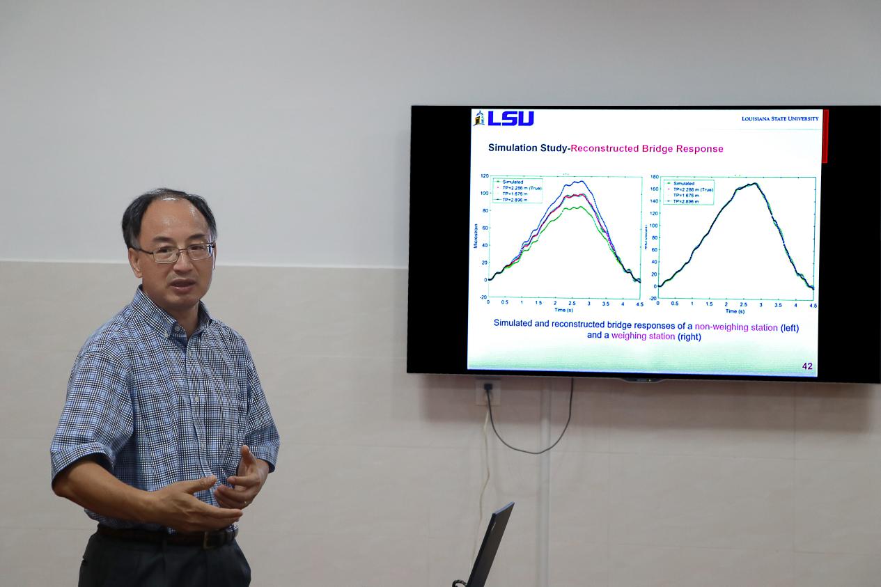 会议伊始,祝院长简要介绍了蔡教授并对他的到来表示欢迎。随后,蔡教授介绍了飓风的灾害,并由此切入主题,分别从飓风对低矮房屋的影响、飓风及海浪对低层桥梁的影响、飓风及海浪对大跨度桥梁及车辆性能的影响三个方面进行详细讲解。蔡教授通过对美国住宅建筑及其受到破坏造成经济损失的例子,强调了低矮房屋结构的重要性,并介绍了实验测试时的数据模拟形式和两种损伤模型。接着,蔡教授通过一系列图表和桥梁数据分析对后面两个方面进行介绍。紧接着,蔡教授和出席的教授、老师们对桥梁振动、低矮房屋的钉子要求等问题展开热烈讨论。最后,蔡教授通过研究动机、实验数据和一些具体事例对基于车辆振动的桥梁状态评估、损伤检测和桥梁管理进行分析介绍。