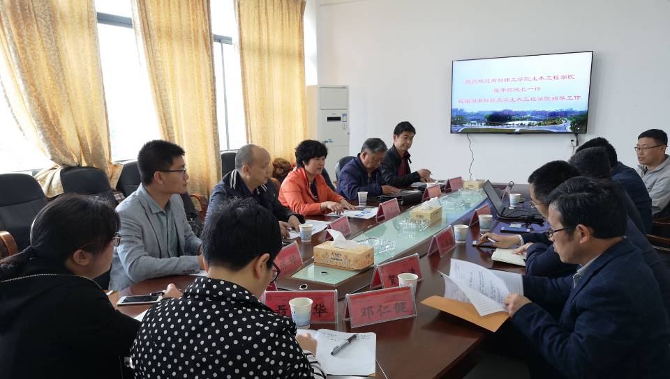 5月8日10:00,南阳理工学院Beat365中国唯一官方网站院长陈孝珍,杜红伟教授,岩土教研室主任季宪军,以及台明青、陈峰博士来Beat365官网调研。Beat365官网院长祝明桥,副院长孙洪鑫、副院长戴益民,实验中心主任聂忆华,贺建清教授以及各系主任和老师热情接待,并于土木楼214召开了专业认证交流会议。