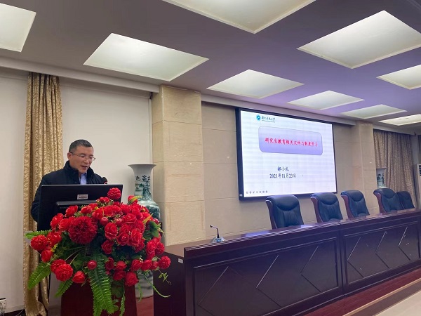 首先,学院分管研究生工作的副院长郝小礼教授组织学习了上级有关研究生教育文件及政策精神、学校研究生培养管理的相关规章制度。其中,重点学习了研究生导师指导行为准则、研究生指导教师管理办法、全面落实研究生导师立德树人职责实施细则等文件。郝院长强调导师是研究生培养的第一责任人,要强化对研究生的思想政治教育,既做学业导师又做人生导师,要尽心尽力投入研究生指导,正确履行指导职责,严格把关学位论文质量,严格遵守学术规范,做研究生成长成才的指导者和引路人。